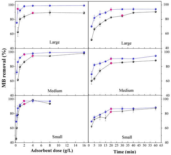 Optimal adsorption conditions are showed in Figure 5. It is observed that an increase in the dose of OPEFBF, in three particle sizes, favors the adsorption of MB. This is because an increase in the adsorbent dose allows a greater number of sites available for the MB adsorption [59]. In the case of raw OPEFBF, the smallest particles (250–425 µm) present the lowest dose (2 g/L) and contact time (20 min), reaching efficiencies of 93.1 ± 0.6%. Medium OPEFBF (425–600 µm) and large OPEFBF (600–850 µm) required a dose of 4 g/L, with optimal contact times of 20 and 30 min, respectively. With these two sizes, removal efficiencies of 87.3 ± 0.7 and 88.7 ± 0.8% were achieved. The greater efficiency of the smaller fibers, as with COD, is associated with the larger surface area (and thus a greater number of active groups) present in the raw OPEFBF [21]. The efficiency of medium and large OPEFBF did not present significant differences (p value > 0.05); this is because they present a very high similarity in distribution in terms of their size similarity (>90%).