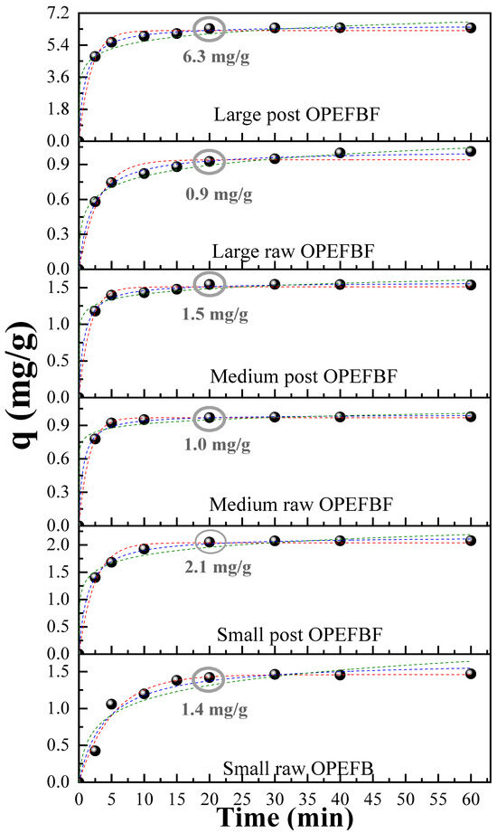 Kinetic models for MB (concentration = 5 mg/L) adsorption in raw/post OPEFBF. Black points = experimental data, red line = pseudo-first-order model (PFO), blue line = pseudo-second-order model (PSO), green line = Elovich model (E).