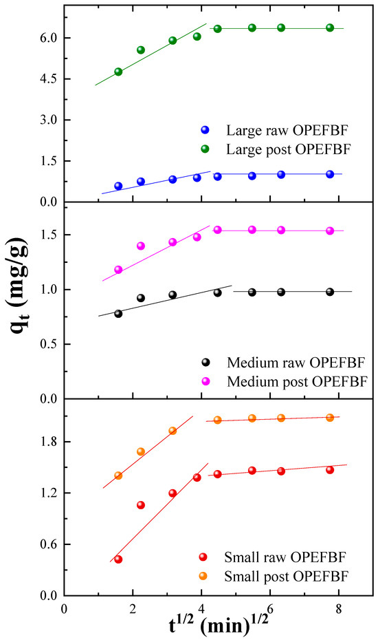 In Table 2, the fitting parameters for the intraparticle diffusion model are also provided. This model can be valuable for identifying reaction pathways and adsorption mechanisms, and it also enables the prediction of the rate-controlling step in adsorption [67]. In the context of adsorption of a contaminant present in an aqueous medium, the transfer of the contaminant commonly occurs through processes of film diffusion or external diffusion, surface diffusion and pore diffusion, or a combination of these mechanisms. The presence or absence of these processes can be determined through the analysis of the qt vs. t1/2 curve. For instance, if the curve passes through the origin, it indicates that the adsorption process is solely limited by intraparticle diffusion. However, in Figure 7, two linear segments are observed, suggesting that the adsorption process is under the control of a two-step mechanism. In the first stage, film diffusion occurs, where MB is transported from the liquid phase to the external surface of raw/post OPEFBF through the hydrodynamic boundary layer. Meanwhile, in the second stage, intraparticle diffusion occurs, meaning there is a slow migration of MB molecules from the exterior of raw/post OPEFBF to their pores.
