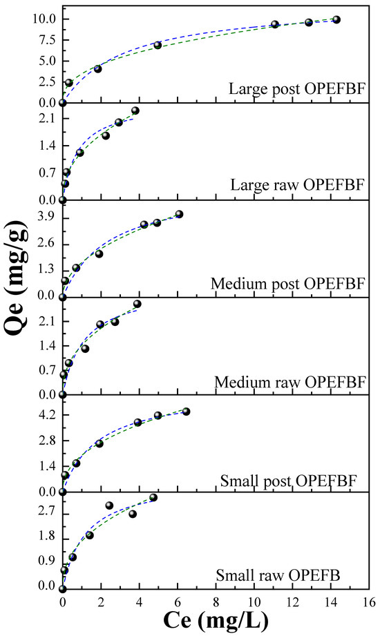 While the experimental data conform to the Freundlich model, the qe value in the Langmuir model provides insight into the adsorption capacity of OPEFBF. These values confirm what was previously mentioned: small raw OPEFBF exhibit the highest adsorption capacity (3.97 mg/g) compared to medium/large raw OPEFBF (2.72/2.75 mg/g), due to their higher specific surface [19]. Conversely, post OPEFBF materials display a higher adsorption capacity, with large post OPEFBF exhibiting the highest adsorption capacity (12.02 mg/g), which is attributed to the modification process experienced by the fibers during biofilter operation [60]. Additionally, the value of the Freundlich isotherm parameter (n), which is associated with adsorption intensity, falls within the range of 2.1 to 2.5, i.e., it lies in the Henry region: 1 < n < 10. This indicates favorable adsorption [61,68].
