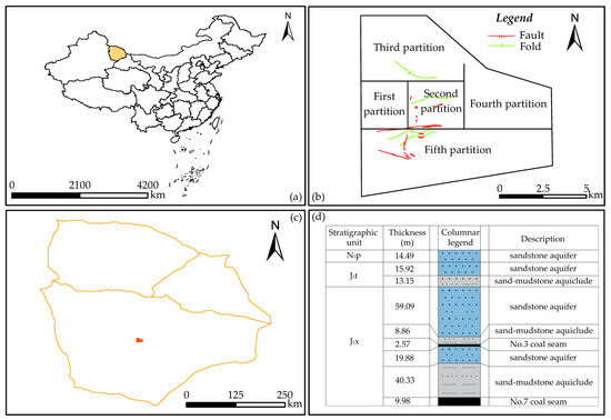 Study area. (a) Location of Hami City, Xinjiang; (b) The partition map of the Dannanhu No. 7 Coal Mine; (c) Location of the Dannanhu No. 7 Coal Mine in Hami City; (d) Schematic diagram of main coal seam and aquifer.