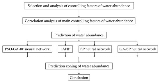 First of all, the correlation analysis was carried out for the main control factors of aquifer water abundance, the main factors with high correlation were removed, then, the remaining main control factors were used to calculate and predict the unit water inflow. Finally, the prediction zone of water abundance was determined. The research route of this paper is shown in Figure 2: