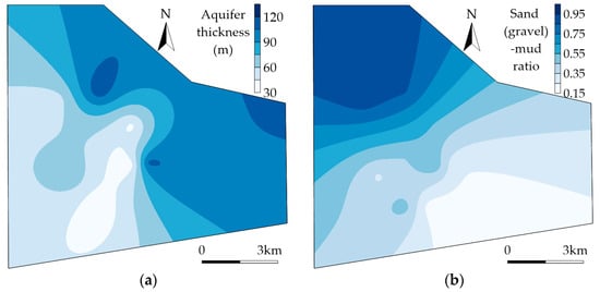 The number of sandstone and mudstone interlayers reflects the overlapping status of aquifer and aquifuge, which can reflect the strength of the hydraulic connection. The mudstone (siltstone) can weaken the water abundance of aquifer, and the more sandstone and mudstone interlayers of the same thickness of aquifer indicate that they are more aquifuge, and the more water abundance of aquifer is weakened. In the northwest of the study area, the number of sandstone and mudstone interlayers is the smallest, and the sand-gravel ratios are all greater than 0.5, indicating that the effective aquifer thickness is larger and the water abundance is richer here (Figure 3e).