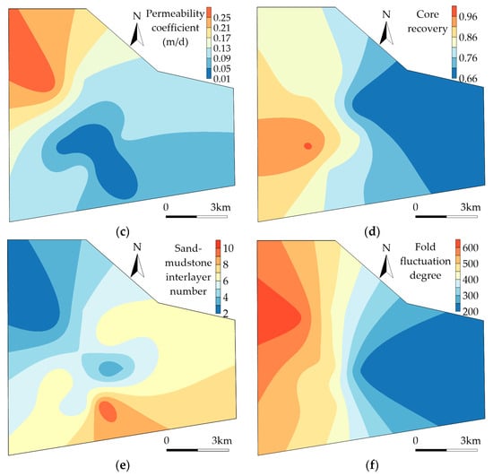 Contour map of water abundance control factors. (a) Aquifer thickness; (b) Sand (gravel)-mud ratio; (c) Permeability coefficient; (d) Core recovery; (e) Sand-mudstone interlayer number; (f) Fold fluctuation degree.