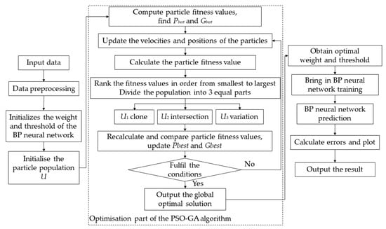 The PSO-GA-BP prediction model utilizes a neural network integrated with a GA into a PSO algorithm, whereby the PSO algorithm serves as the primary component. This optimizes the weight and threshold of the BP neural network in order to achieve the objective of reducing the BP neural network’s output error (Figure 4).