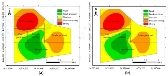 To ensure the model’s reliability, we selected the actual unit water influx value of the same sample as the test set. We then used the model’s predicted boundary value to divide the mine area’s water abundance. The water-rich zoning map, depicted based on the actual unit water inflow values as shown in Figure 6, exhibits slightly larger areas of strong, stronger, weak, and weaker water abundance regions. However, the overall disparity was minimal, thereby affirming the model’s reliability.