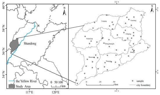 The study area was Liaocheng City, Shandong Province, which is known as the hinterland of Luxi Plain. It covers approximately 8715 km2 and is located between 116°16′ E to 116°32′ E and 35°47′ N to 37°05′. The prefecture-level city of Liaocheng administers eight county-level divisions, including two districts (Dongchangfu, Chiping), one county-level city (Linqing) and five counties (Donge, Gaotang, Guangxian, Shenxian and Yanggu) (Figure 1). Liaocheng features a semi-arid continental climate, with low precipitation and intensive evaporation. The average annual precipitation and evaporation in this area are 578.7 mm and 1708.7 mm, respectively. Half of the precipitation is concentrated from June to August, while the minimum rainfall is in January.