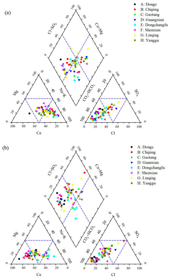 Piper diagram of groundwater samples in 2018 (a) and 2020 (b).