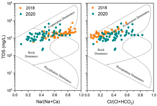 Gibbs diagrams [48] can effectively illustrate the primary factors influencing the water quality. According to the diagram (Figure 3), a significant evolution of ions in the water was observed during 2018–2020. Almost all the samples were distributed in the rock dominance zone and evaporation dominance zone of the Gibbs plot, indicating that, apart from rock weathering processes, the groundwater hydrochemistry was also regulated by climatic factors. As groundwater flows underground and comes into active contact with rocks, water–rock interactions are generally the common factor that influences the evolution of natural groundwater chemistry [21]. Moreover, due to the fact that the study region is semi-arid, groundwater in this area experiences intense evaporation. Groundwater evaporation can elevate the concentrations of major ions and TDS, potentially leading to the precipitation of minerals, such as silicate and carbonate minerals. This phenomenon may cause the plots to shift towards the evaporation dominance zone on the Gibbs diagrams [21]. Notably, some samples were plotted out of the frame, and more samples were found in 2018. It was reported that the ion components of global water are almost always within the Gibbs plot, but when influenced by human activities, the samples may fall outside the frame [44]. This result was consistent with the ion source analysis mentioned above. Compared to 2020, groundwater in this region was more significantly affected by human activities in 2018.