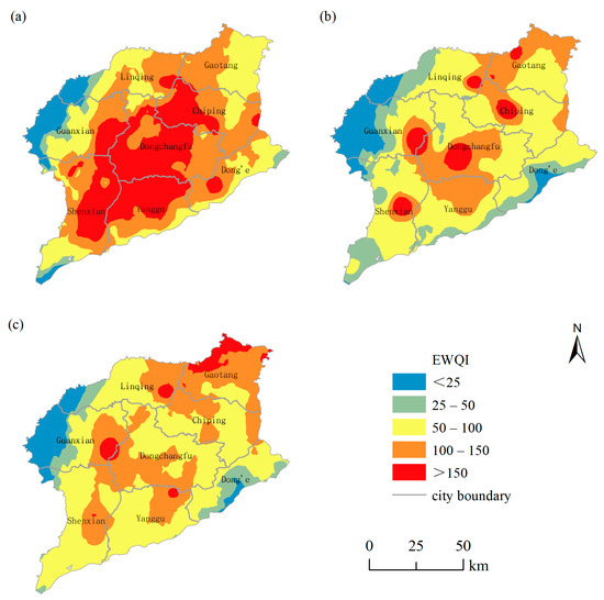 Spatial distribution maps of EWQI classification in 2018 (a), 2019 (b) and 2020 (c).