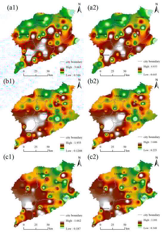 Spatial distribution maps of health risks in 2018 (a), 2019 (b) and 2020 (c): adults (1), children (2).