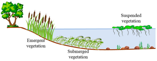 In general, aquatic plants can be classified into rigid plants and flexible plants according to the bending deformation degree of stems under the action of water flow, and they can be further classified as emergent, floating, or submerged plants according to their forms, as shown in Figure 1. The presence or absence of vegetation and the distribution of vegetation species in river cross-sections are largely determined by the magnitude of flow velocity. For instance, in a main channel where the flow velocity is high, only mosses tend to grow, while, if the flow velocity is low in the main channel, submerged flexible plants and floating plants may dominate [18]. On the edges of rivers where the flow velocity is much lower, plants usually grow better, with rigid emergent herbs being the most common type [19].