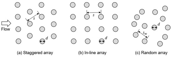 Plan view of cylinder element distribution patterns. In (a) a staggered array and (b) an in-line array, the center-to-center distance to the nearest neighbor is s for all cylinders; in (c), a random array, the center-to-center distance to the nearest neighbor, snc, differs for each cylinder.