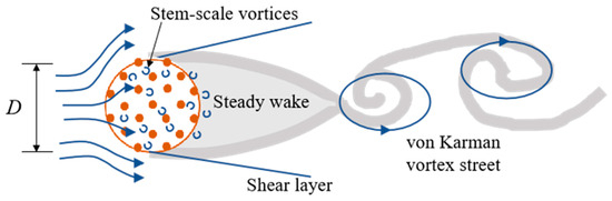 Two types of vortices of different scales can be observed downstream of the patch, as shown in Figure 5. One is the small-scale Karman vortex induced by single stems, and the other is the large-scale Karman vortex caused by the entire canopy patch [84]. Since some water bleeds through the canopy and flows directly downstream, its longitudinal momentum will inhibit the interaction of shear layers on both sides of the canopy. Therefore, the formation of patch-scale Karman vortices will be delayed compared with the case of a solid cylinder. Zong and Nepf [109] carried out experimental investigations based on circular patches of different sizes and densities, and found that, with decreasing canopy density, the length of the wake region increased and the intensity of patch-scale Karman vortices decreased.