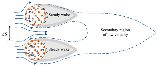 Studies have also been conducted to investigate the interactions between two neighboring canopies [102,110,111]. For two neighboring canopies distributed side-by-side in a channel, a wake region with low velocity will form downstream of each individual canopy, similar to flow patterns under the effects of a single patch, and this region is named the primary sedimentary region. As the flow develops downstream, the two wakes interact and result in a secondary sedimentary region, as shown in Figure 6. The formation of the secondary sedimentary region will promote the longitudinal extension of the region with enhanced deposition, thus further promoting the merging of the two adjacent canopies [16,111]. The lateral and longitudinal spacing between neighboring canopies also have important effects on flow patterns [110]. Vandenbruwaene et al. [102] simulated the growth and expansion of canopies by increasing the patch size (D) and decreasing the space between two side-by-side canopies (), and revealed the change in flow patterns under the effects of canopy growth. The results showed that the interaction between two adjacent canopies tended to increase initially and then decrease with the continuous increase in . When the value of was greater than a certain threshold, the two adjacent canopies began to act on the flow as a whole. Based on these mechanisms, researchers have further explored the growth and succession process of aquatic vegetation using numerical simulations [16,112,113].