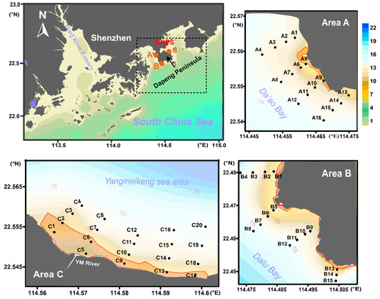 Map of sampling stations. Areas A, B, and C are located in the Da’ao Bay (DAB), Dalu Bay (DLB), and Yangmeikeng sea area (YMKSA), respectively. The DNPS and YM River represent the Daya Bay Nuclear Power Station and Yangmei River, respectively. The orange area in the figure indicates the presence of coral reefs. The color bar indicates the bottom depth (m).