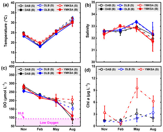 Time series for the averaged survey values of temperature (a), salinity (b), DO (c), and Chl a (d) of the surface (dashed line, denoted with (S)) and bottom (solid line, denoted with (B)) waters (mean ± SD).