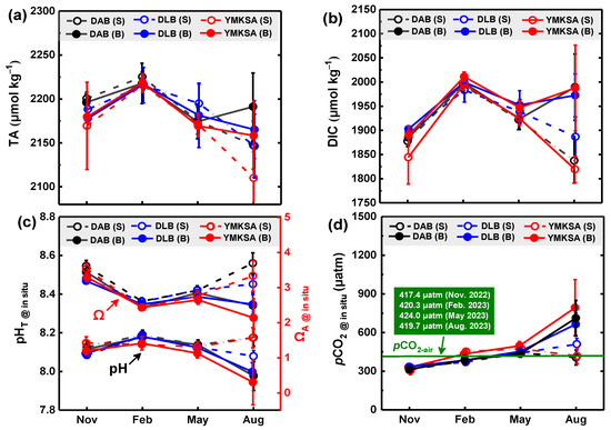 Time series of averaged survey values of TA (a), DIC (b), pHT@ in situ (c), and pCO2@ in situ (d) in the surface (dashed line denoted with (S)) and bottom (solid line denoted with (B)) waters (mean ± SD).