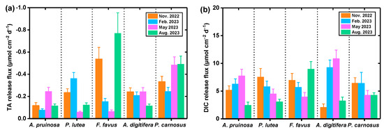 The release fluxes of TA (a) and DIC (b) by coral metabolism in different seasons (positive indicates release; negative indicates absorption).