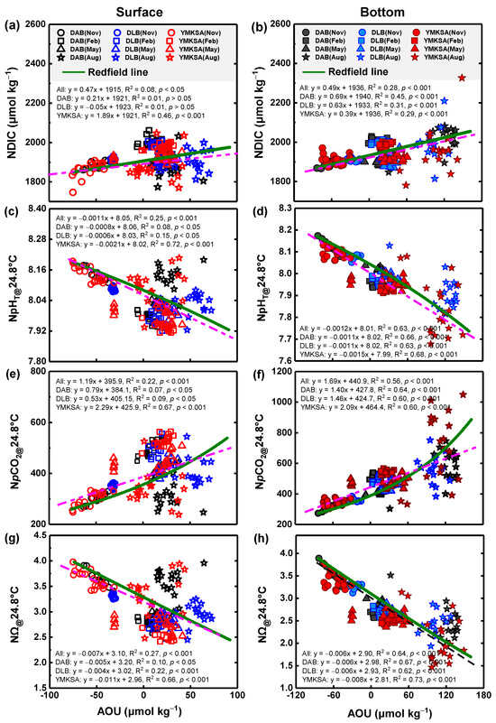 Regionally, the AOU has a very significant linear relationship with the NDIC, NpHT@24.8°C, NpCO2@24.8°C, and NΩA@24.8°C in the bottom water of the DAB, DLB and YMKSA (p < 0.001, n = 192); however, their relationship was relatively weak in the surface water due to factors such as the air–sea exchange (Figure 7). In terms of the DIC, the slopes of the NDIC–AOU regression for the bottom water of the DAB and DLB, 0.69 and 0.63 (Figure 7b), were close to the Redfield stoichiometry, i.e., the C/O molar ratio of 0.77 (106/138) [74], which was similar to those observed in other coastal waters, e.g., Gulf of Trieste [75] and North Yellow Sea [26], reflecting the dominant role of phytoplankton photosynthesis and microbial respiration. However, the slope of NDIC–AOU regression in the YMKSA was 0.39, which was much lower than that in Redfield stoichiometry, which may be related to the metabolism of coral reef organisms, such as fish and corals [76,77,78,79].