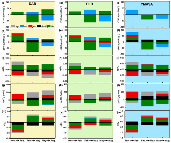 The contribution of temperature (tem), mixing (mix), air–sea exchange (a-s), coral activity (sc), and biochemical processes (bio) to seasonal variation in the CO2 parameters in the DAB (a,d,g,j,m), DLB (b,e,h,k,n) and YMKSA (c,f,i,l,o).