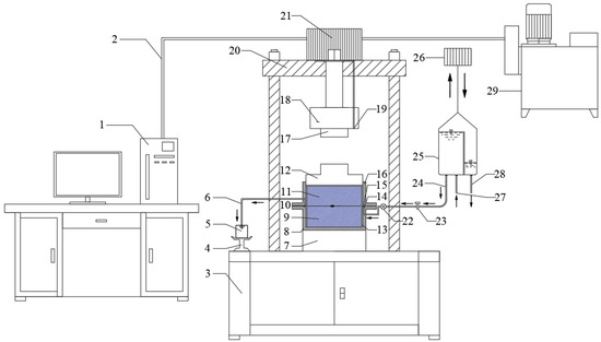 Schematic diagram of shale fracture seepage testing equipment. 1—Computer; 2—Signal transmission line; 3—Equipment base; 4—Precision balance; 5—Measuring cylinder; 6—Outlet pipe; 7—Metal base plate; 8—Lower shear box; 9—Lower sample; 10—Water outlet of shear box; 11—Upper sample; 12—Metal cover plate; 13—Rubber water stop; 14—Sealing ring; 15—Water inlet of shear box; 16—Upper shear box; 17—Normal load loader; 18—Normal load sensor; 19—Normal displacement sensor; 20—Metal frame; 21—Normal load controller; 22—Pressure head sensor; 23—Inlet valve; 24—Outlet pipe of water tank; 25—Constant—head water tank; 26—Water tank lifting device; 27—Inlet pipe of water tank; 28—Overflow pipe of water tank; 29—Hydraulic source.