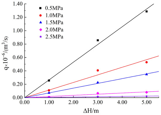 In the process of normal loading, the relationship between seepage discharge via sample S1 and water head difference is shown in Figure 5. For different samples, the change law of seepage discharge with water head difference was similar, and sample S1 was taken as an example in this paper. It can be seen from Figure 5 that there is a linear increasing relationship between seepage discharge and water head difference: