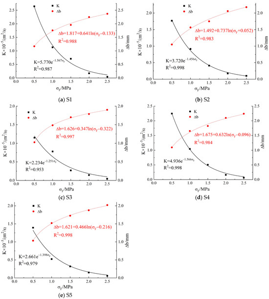 The relationships between K and σF are shown in Figure 6. K showed a decreasing trend of negative exponential function with the increase in normal stress; meanwhile, the fracture closure Δb showed an increasing trend of logarithmic function. The specific was the following: