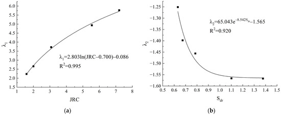 The relationship between the fitting parameters and fracture surfaces topographic characteristic parameters. (a) The relationship between λ1 and JRC; (b) the relationship between λ2 and Sdr.