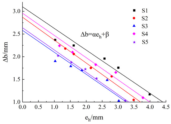 After eh was inversely calculated from Formula (17), the relationship between Δb and eh can be obtained as shown in Figure 8. The fitting coefficients α and β and the fitting degree R2 of the fitting curve are shown in Table 4. Δb decreased linearly with the increase in eh, as follows:
