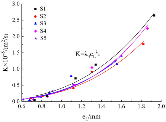 Figure 9 shows the relationship between K and eL. And the fitting coefficients λ3 and λ4 and the fitting degree R2 of the fitting curve are shown in Table 5. K decreased with the decrease in eL, and the decreasing rate decreased gradually. This showed that with the continuous contact and closure of the upper and lower fracture surfaces, the seepage channel was continuously compressed, and the compressibility of the fracture gradually decreased. The fitting relationship was as follows:
