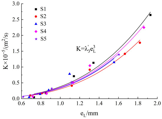 where λ3 and λ4 are the fitting coefficients with λ3 > 0 and λ4 > 0. About the index λ4, the maximum value was 3.176, the minimum value was 2.871, and the average value was 2.998. Therefore, it could be considered that the relationship between K and eL was approximately cubic relationship. In Formula (20), λ4 was assumed to be 3, and the following formula was obtained: