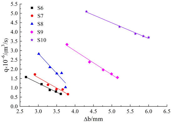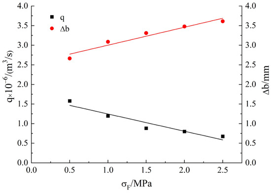 Although the expression forms of Formulas (12)–(14) were different from that in this paper, but, and , it could be seen that as σF increased, Δb increased, its increase rate was slower and slower, and the changing trend was the same as that of Formula (11), which also verified the change law of seepage discharge under the change in normal stress.
