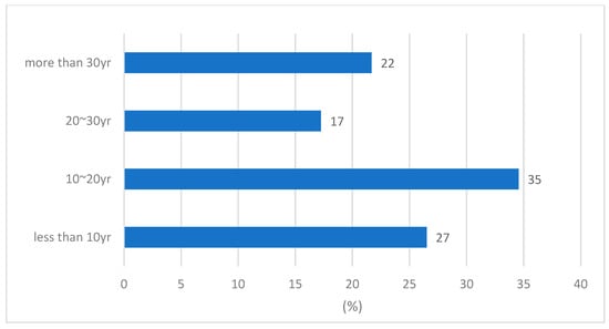 As of the end of 2021, Cheong-Ju (CJ) City, the study area in Chungcheongbuk-do, had a population of 836,711 individuals receiving water supply at a rate of 97.2%. The city supplies a total quantity of 350,000 m3/d of domestic water from Jibuk (BJ) and CJ water treatment plants. The total length of pipelines in CJ City is 3066 km, and as shown in Figure 2, 78% of them are ˂30 years old. Therefore, the proportion of aged pipes is relatively low.