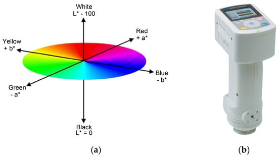 CIE L*a*b* color space (a). Portable spectrocolorimeter CM-700d (b). L represents brightness between 100 (white) and 0 (black), whereas a and b represent color (–a, green; +a, red; −b, blue; +b, yellow).