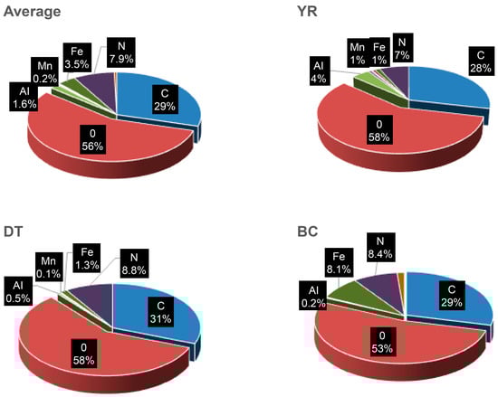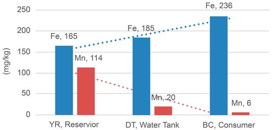 Furthermore, the ICP–OES analysis of the samples obtained from the CJ City water supply system revealed that the concentration of colorants in samples increased from an average of 165.14 to 235.53 mg/kg for Fe and decreased from 113.81 to 6.00 mg/kg for Mn in the YR, DT, and BC samples (Table 5 and Figure 6). These results are consistent with the FESEM–EDS analysis results, in which, the Fe concentration increased to 1.16%, 1.31%, and 8.12% in the YR, DT, and BC samples, respectively, and the Mn concentration decreased to 0.60%, 0.14%, and 0%, respectively. It is evident that in the water distribution network, the concentration of Mn not treated in the water treatment process decreases, as Mn settles in reservoirs and tanks, whereas that of Fe increases due to pipe corrosion. Based on FESEM–EDS test results, reference materials were prepared according to the content of Fe and Mn.