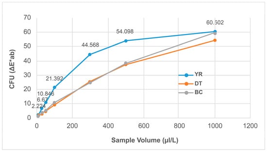 As shown in Figure 7 and Figure 8, the ΔE*ab values (D65) of YR, DT, and BC samples increased proportionally with their concentrations. As shown in Table 8, the R2 values were 0.8971, 0.9788, and 0.9881 for YR, DT, and BC samples, respectively, indicating that the color difference can be used to quantitatively measure coloring substances.