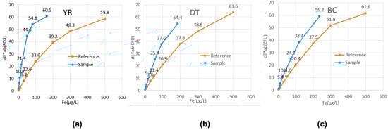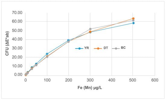 The coloring reference material solutions were passed through filters, which were then dried at room temperature for 3 h. We conducted an MFC test of the discolored surface of the dried filter. As shown in Figure 9 and Figure 10, the color difference ΔE*ab (D65) increased with the concentration of the Fe and Mn reference materials in the YR, DT, and BC samples. The regression analysis between the reference material concentration and color difference (Table 12) revealed a high concentration of the Fe and Mn reference materials in the YR, DT, and BC samples. The regression analysis between the reference materials and MnO2 might be a useful method for measuring colorants within the range of the Fe and Mn content and ratio in field samples.