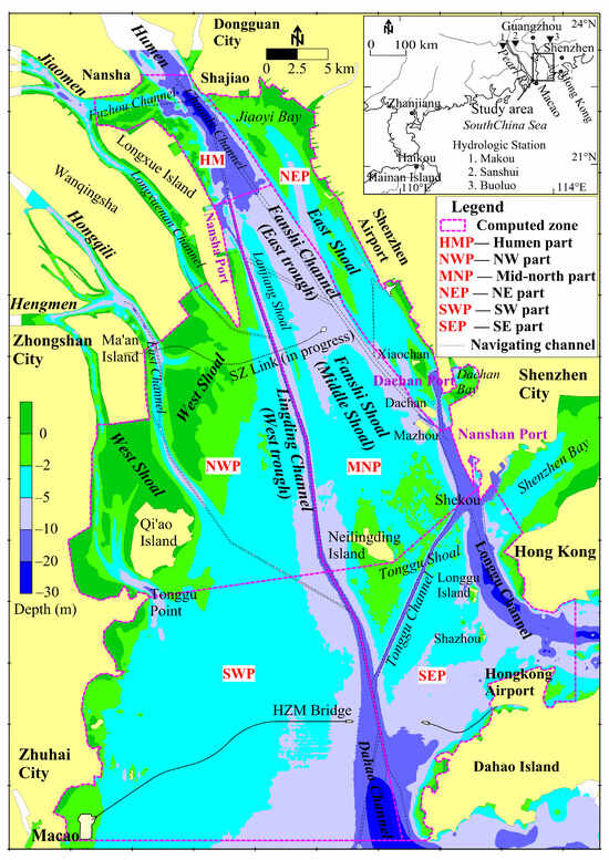 Lingding Bay is a horn-shaped bay covering an area of approximately 1700 km2 []. The northern edge of the bay is at Humen, and the southern edge is at Macao-Dahao Island. The geomorphic pattern of Lingding Bay is known as the “three shoals and two troughs” (Figure 1), comprising the East shoal, the Middle Shoal (Lanjiang, Fanshi, and Tonggu Shoals), and the West Shoal, as well as the East Trough (Chuanbi and Fanshi channels) and the west trough (Lingding Channel). There are four outlets (Humen, Jiaomen, Hongqili, and Hengmen) of the Pearl River in north-western Lingding Bay. The annual runoff and sediment discharge of the Pearl River are approximately 300 billion m3 and 70 million tons, respectively. As the main water area of PRD for matter and energy exchange, Lingding Bay account for 61.1% and 54.0% of the total Pearl River runoff and sediment load, respectively []. The flood season typically occurs from April to September, and the river runoff and sediment loads during the flood season account for more than 70% and 90% of the annual totals, respectively [].
