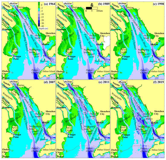 Subaqueous topography of Lingding Bay in the year (a) 1964, (b) 1989, (c) 1998, (d) 2007, (e) 2011, and (f) 2019.