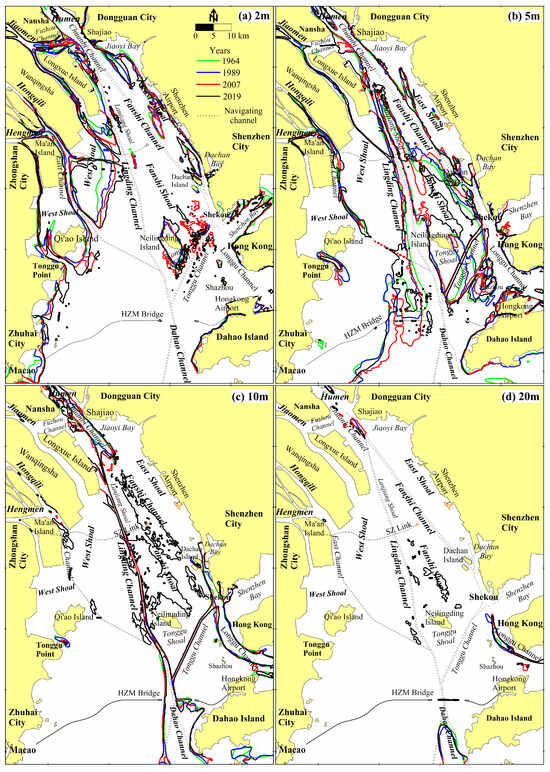 In 1964 and 1989 (Figure 2a,b), the geomorphic pattern named “three shoals with two troughs” was quite clear in Lingding Bay. The shallowest area of the bay is the West Shoal with a depth of less than 2 m. The second shallowest area is the East Shoal with a predominant depth of 2–5 m with some sections of less than 2 m in depth. The water depth of the Middle Shoal is 2–5 m, and a deep trough with a depth of more than 5 m expanded to the east of Neilingding Island in the southern Tonggu Shoal. The deepest area is the Chuanbi, Dahao, and Longgu Channels, with a depth of more than 10 m. The depth of the Lingding and Fanshi Channels is between 5 and 10 m. The 5 m deep troughs in the east and west troughs are connected from north to south, but the 10 m deep troughs are only found in the Chuanbi, Dahao, and Longgu Channels.