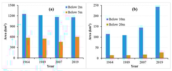 Changes in the water area below the 2 m, 5 m, 10 m, and 20 m isobaths from 1964 to 2019. (a) Below the 2 m and 5 m isobaths, (b) below the 10 m and 20 m isobaths.