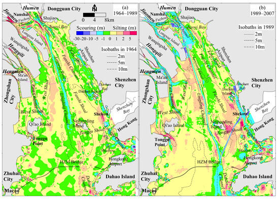 According to the planar distribution of scouring and siltation from 1964 to 1989 (Figure 5a), the West and Middle Shoals, the Fanshi, Fuzhou, and Dahao Channels underwent a silting process with a silting thickness of predominantly 0–1 m and more than 1 m in some areas. The East Shoal and southern Lingding Bay except the Dahao Channel showed little change. The Lingding Channel was being scoured with a range of 1–2 m.