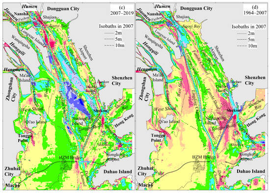 In addition, the reclamation area in the West Shoal accounted for 64% of the total amount in the bay, and the large-scale reclamation could cause the deltaic channels to rapidly extend south-eastward. Therefore, the deposition center in the West Shoal moved southeast simultaneously, and the 2 m and 5 m isobaths moved southward and eastward, which caused the West Shoal to expand and the Lingding Channel to narrow from 1964 to 2007 [].