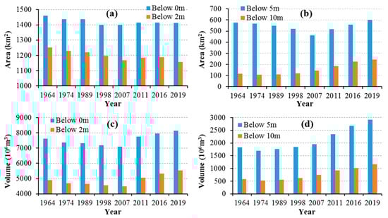 The water volumes below the 0 m and 2 m isobaths were approximately 7620 × 106 m3 and 4890 × 106 m3 in 1964, respectively (Figure 6c); they gradually decreased from 1964 to 2007 by 7% and 8%, respectively, but gradually increased from 2007 to 2019 by 15% and 23%, respectively. The water volumes below the 5 m and 10 m isobaths were approximately 1830 × 106 m3 and 580 × 106 m3 in 1964, respectively (Figure 6d); they decreased from 1964 to 1974 by 8% and 11%, respectively, but gradually increased from 1974 to 2019 by 72% and 123%, respectively. The water volumes below the different isobaths in 2019 were all greater than those in 1964 and those below the 5 m and 10 m isobaths had a far greater increasing proportion.