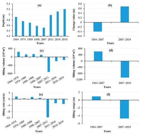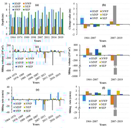 Changes in the water depth, silting volume, and the silting rate of different zones from 1964 to 2019. (a) The mean depth in different years; (b) the change value of the depth before and after 2007; (c) the silting volume in different decades; (d) the silting volume before and after 2007; (e) the silting rate in different decades; (f) the silting rate before and after 2007.