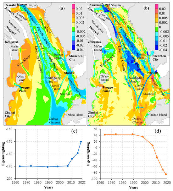 Patterns of morphological changes in Lingding Bay quantified by EOF analysis. (a) Contoured eigenvectors of the first mode; (b) contoured eigenvectors of second mode, (c) eigenweightings of the first mode, (d) eigenweightings of the second mode.