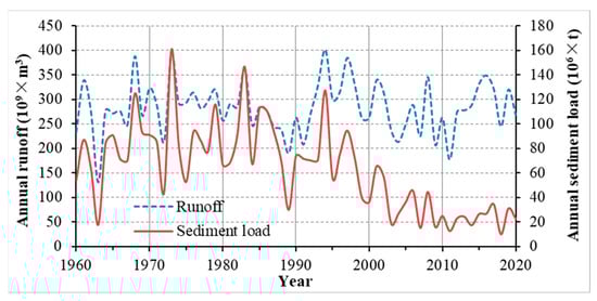 The sediment load discharged into Lingding Bay accounted for 54.0% of the total of the Pearl River. The annual runoff and the sediment load of the Pearl River changed slightly from the 1960s to the 1990s, and the annual sediment load decreased by 65% after the 1990s to the present with the annual runoff changed slightly (Figure 10), which was predominantly caused by dam construction in the river basin rather than a precipitation change [,]. Therefore, the sediment input of the bay decreased considerably after 2000.
