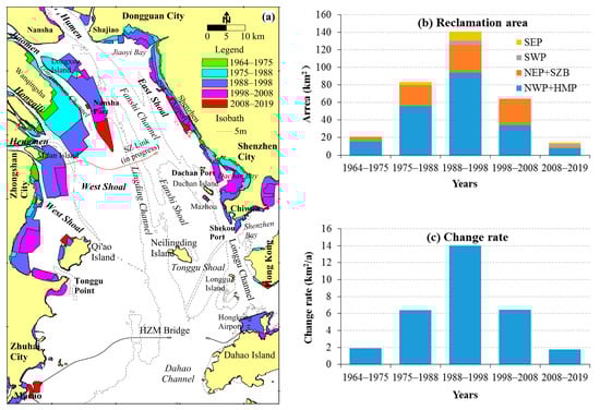 Estuarine regions are usually well-developed and frequently affected by human activities including estuarine regulation, shoal reclamation, port construction, sand dredging, and sea-crossing bridge construction, changing the estuarine boundary and topography, and then affect the morphological evolution and the geomorphic form of estuarine regions [,,,,,]. In recent decades, the main human activities in Lingding Bay have included estuarine reclamation, sand dredging, and port construction [,,,,].
