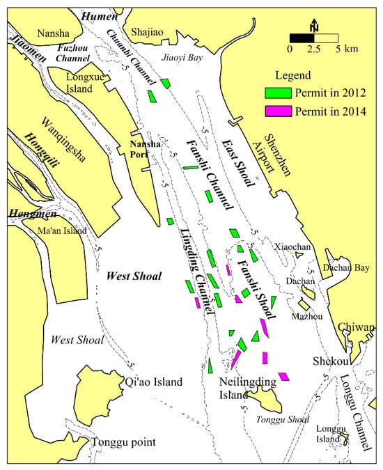 Sand-dredging activities in Lingding Bay were related to regional economic development and surrounding reclamation projects. In the 1980s, sand-dredging activities began in the Chuanbi Channel near Human and moved to the East Trough and the Middle Shoal after the mid-2000s, which was synchronized with the time of the topographic changes. In 2012 and 2014, there were 25 sand-dredging zones in northern Lingding Bay approved by the local authority encompassing a total area of 13.14 km2. These sand-dredging zones were predominantly distributed in the Fanshi Channel and Fanshi Shoal, with only a few in the West Shoal and Chuanbi Channel (Figure 12). This result agrees with the dominant mode of morphological change, with reduction in channel depth and deposition the deepened areas (Figure 9). Therefore, the high-intensity sand-dredging activities resulted in large and irregular deep holes and caused the aberrant changes in Lingding Bay recorded in recent years.